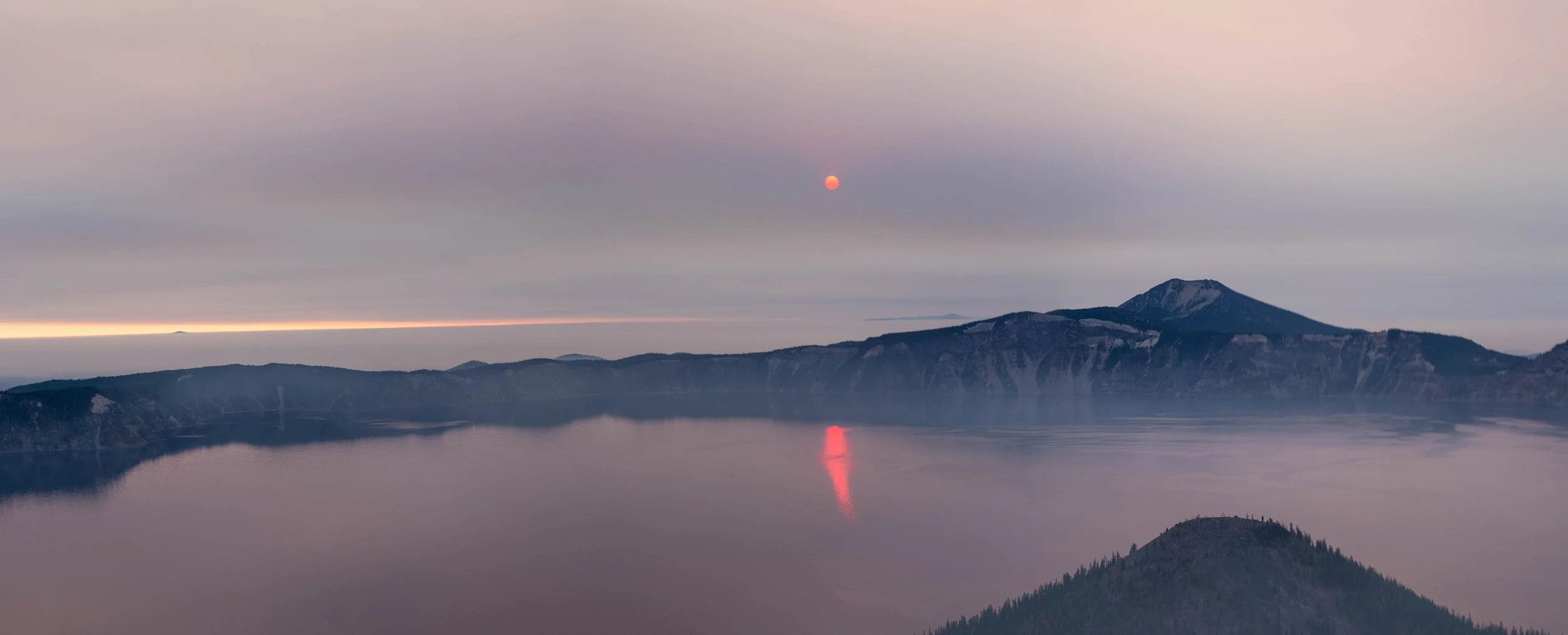The sun sets between two distant peaks. Smoke still blanketed the lake, obscuring the calm waters beneath.